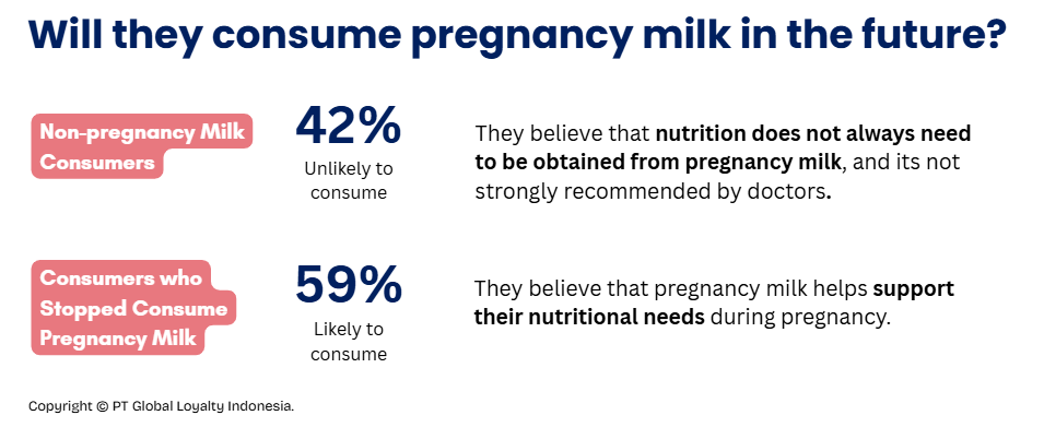 From this group of pregnant women, we also asked about their interest in consuming pregnancy milk in the future. About 42% of those who had never consumed pregnancy milk stated they were unlikely to consume, as they felt their nutritional needs could be met through other means and the product was not strongly recommended by their doctors. Meanwhile, 59% of mothers who had previously stopped consuming pregnancy milk indicated they were likely to consume it again to support their nutritional needs.