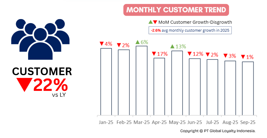 A deeper analysis of the causes behind the sales decline shows that it is primarily driven by a decline in the number of customers, which fell by 22% compared to last year. This decline is also reflected in monthly trends, showing consistent negative growth and indicating weak customer retention from month to month.