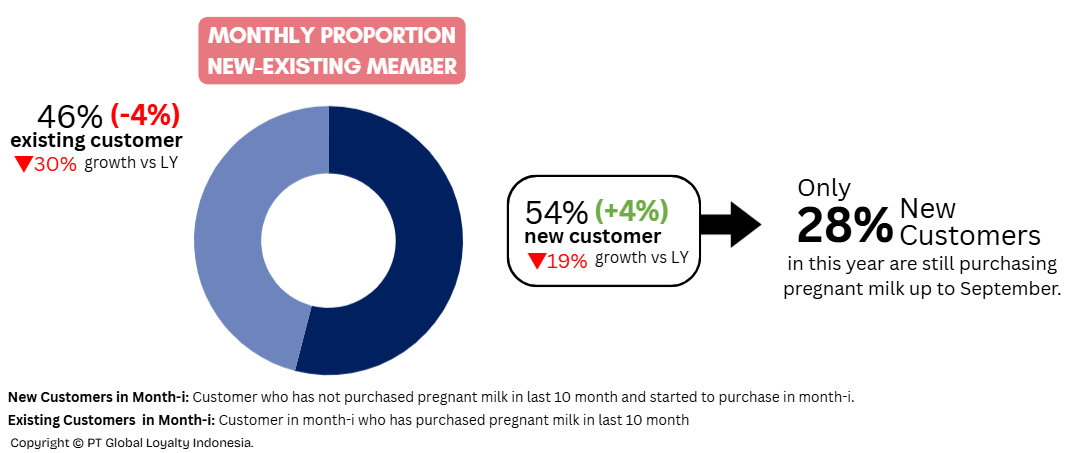 When examined further, the decline affects both existing and new customers. Existing customers, who now make up 46% of the total base, experienced a significant drop of 30%. Meanwhile, although the proportion of new customers increased to 54%, their number still fell by 19% compared to the previous year. Among these new customers, only about 28% made repeat purchases, highlighting that retaining pregnancy milk customers remains a distinct challenge.