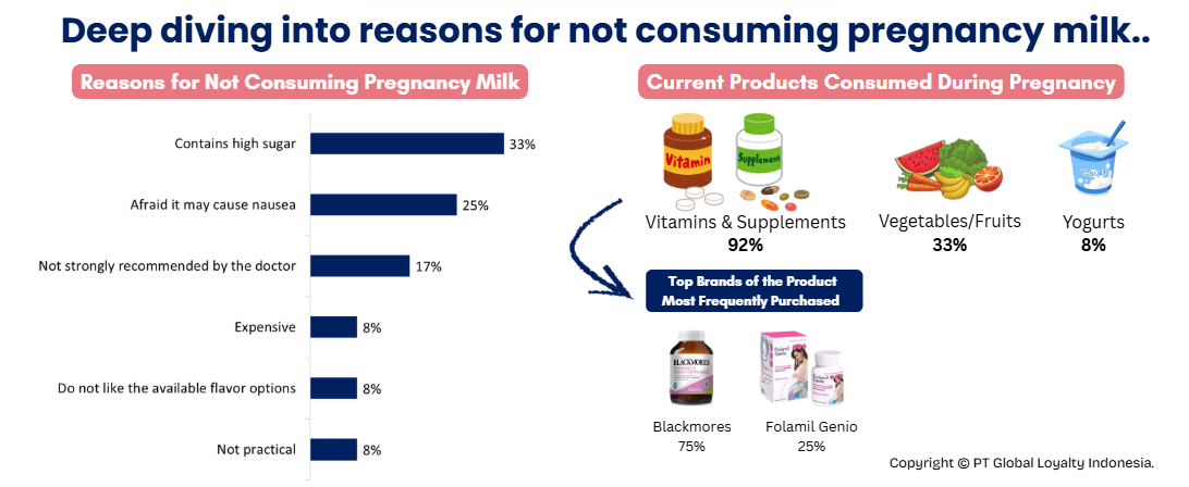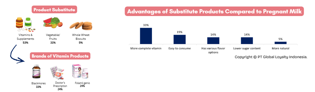 As an alternative, pregnant women tend to choose other sources of nutrition. Their primary choices are vitamins and supplements, with brands such as Blackmores or other doctor-recommended supplements being the most commonly consumed, usually 1–3 times per day. Some respondents even felt that their nutritional needs were already met through their daily food, such as vegetables and fruits, making the addition of pregnancy milk unnecessary.