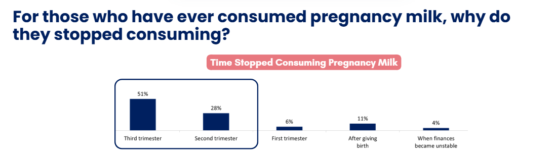 We also explored the reasons why some pregnant women stopped consuming pregnancy milk. The survey showed that most mothers who had previously consumed it regularly tended to stop in the later stages of pregnancy. Some stopped during the second trimester, but the majority did so in the third trimester. At this stage, their primary concern was that consuming pregnancy milk might cause the baby to become overweight.
